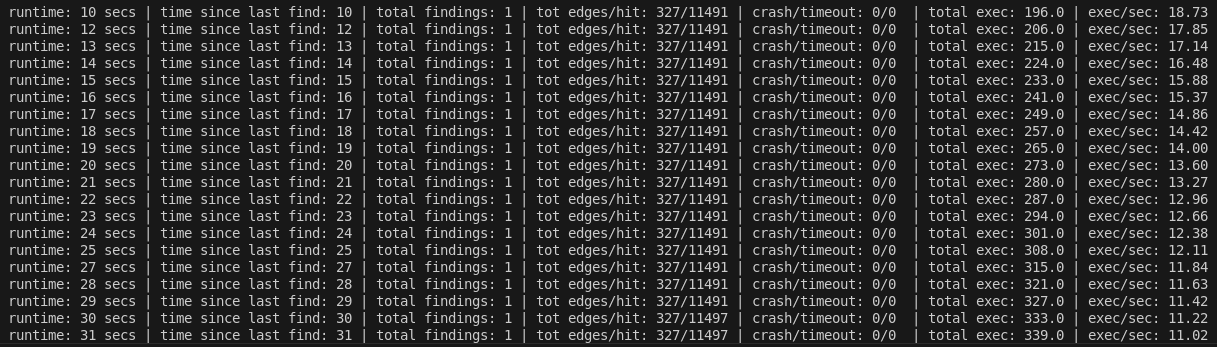 Some bug classes do not result in an immediate crash but in a hang of the target program, for example a function could expect an argument to never be greater than a certain size, but not enforce any verification, which could result in infinite loop. It’s important to catch these errors too without flooding the user with false positives, for that reason the default value of a timeout is quite high and it’s up to the user to adjust it accordingly.